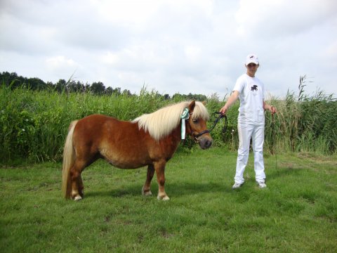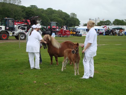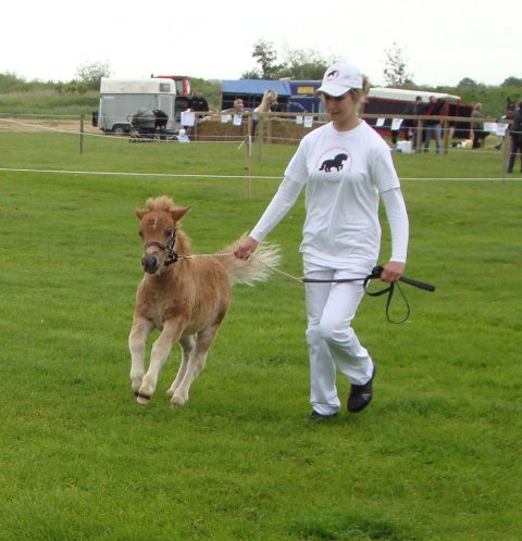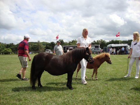Søndervangs Babette, som ikke er så tyk som hun plejer og hendes føl Bådsgårds Baron. Var i dagens anledning i hopla og viste sig for hendes allerbedste side, så hun fik 24p og blev nr. 1/4 i følhoppeholdet. Hun blev også skuets bedste shetlænder og i konkurrencen om skuet bedste hest på tværs af alle racer blev hun nummer 2, kun slået af en af Danmarkst bedste Frederiksborg hoppe. Så vi kan slet ikke få armene ned. Det skal så lige siges at vi nok nærmest ikke har lavet ret meget andet i løbet af dagen end at løbe rundt inde i ringen - så benene er godt nok blevet trætte - men det er jo kun en bagatel når man en enkelt gang opnår sådan et resultet.