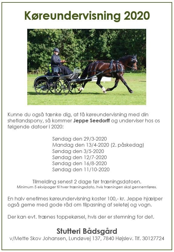 Igen i år er det lykkedes os at få Jeppe Seeforff til at komme her og undervise i kørsel med shetlandsponyer. Vi glæder os til nogle hyggelige træningsdag i løbet af året: