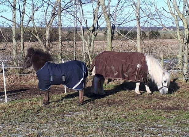 Så fik bette fis føldækken på. Føllet til venstre er født om foråret og Yakari i oktober. Der er 5 måneder imellem de to. Vi er ellers ikke tilhænger af dækken til shetlandsponyer. Men med en hoppemor på næsten 25 år og et føl født i oktober, som er på stald om natten. Har det været nødvendigt, da de begge har tabt en stor del af vinterpelsen. Og lille fis er i strålende humør med det fine blå føldækken - nu er han igen en lille fræk fyr.