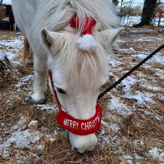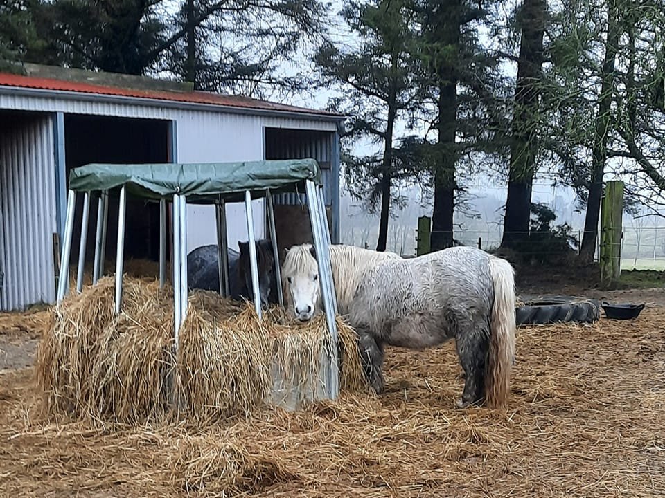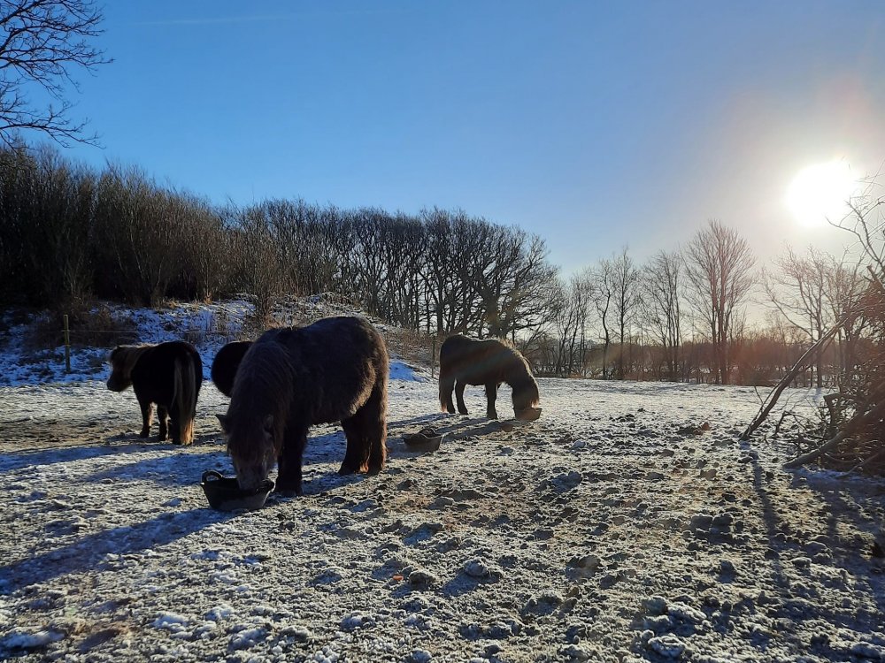 Så blev det heldigvis tøvejr på de sidste dage af året. Det er lidt lettere at passe ponyerne. Og vores bedste investering i 2021 er helt klar høhækkene til wrap rundballer - det har sparet os for meget arbejde. Her er det Bådsgårds Coco som står og spiser.